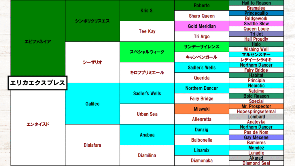 Sadler’s Wells は、エピファネイアの母シーザリオが母父に持つ血統で、エピファネイア産駒にはSadler’s Wells のクロスが発生する形になります。