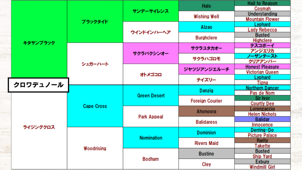 Sir Ivorの血統構成はHaloと重なる部分が多く、サンデーサイレンスの血と相性が良いです。まさにディープインパクトがこのパターンの代表と言えます。